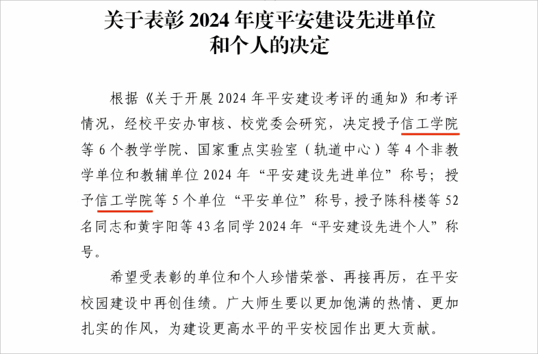 获评2024年“平安建设先进单位”和“平安单位”称号,位列全校第一。学院连续14年获此殊荣。