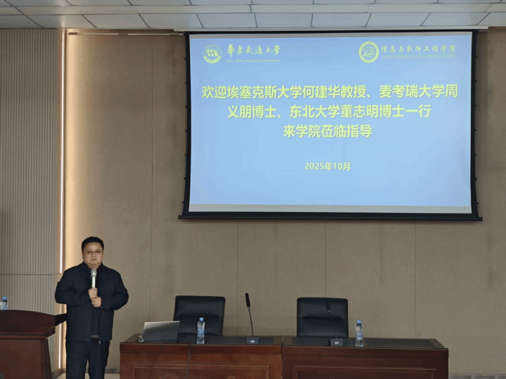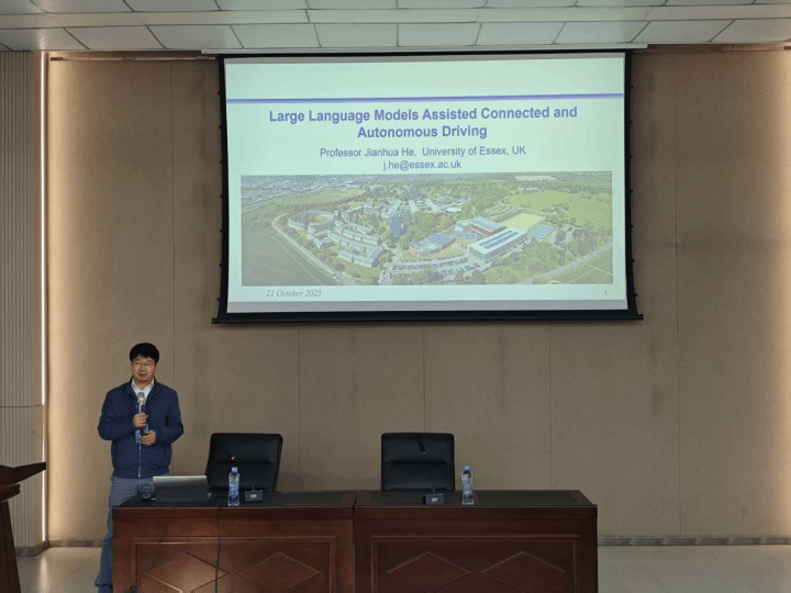 袁朝晖代表学院向全体特邀嘉宾表示热烈欢迎,他介绍了学院的发展现状与合作愿景。何建华作题为“大语言模型辅助的无人驾驶技术”的学术报告,并就人工智能等前沿科研领域与学院教师进行互动。