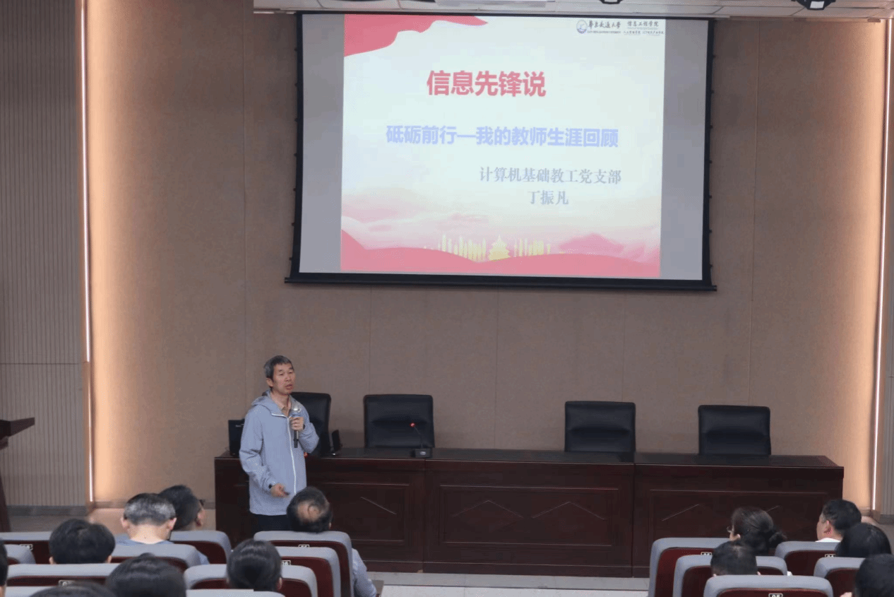 4月25日,信息学院在教5栋校友报告厅举办“信息先锋说”分享交流会。计算机基础教工党支部丁振凡同志以“砥砺前行——我的教师生涯回顾”为主题为学院师生做分享交流。