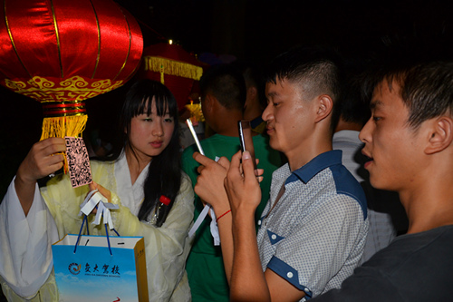 据了解,灯谜会上共设立了普通区九个、对联区三个和终极二维码区一个。在终极二维码区,谜题并不是写在纸上,猜谜者需要用手机扫描挂在花灯下的二维码,谜题便会出现在手机里,“扫二维码答题,真的好高大上啊,这是怎么做出来的啊,大学四年里我也要学会这个。”信息学院14级颜葱葱说道。