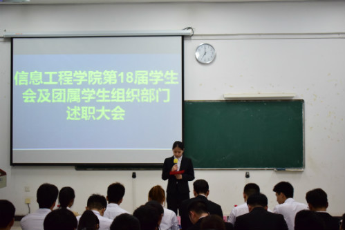 5月19日,信息学院学生会于逸夫楼210教室召开第十八届部长团述职大会。信息学院学生会第十八届主席崔峻铭,副主席武鹏翔、潘飞龙、曹宇博、万诗颀、吴嘉懿、新媒体中心主任刘炜洋、青年志愿者协会会长卢月绒出席本次会议,全体学生会成员与会。