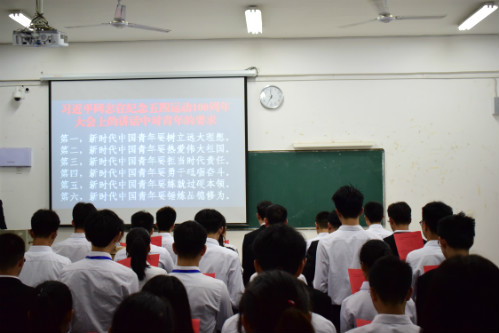 会议伊始,武鹏翔带领大家学习刘奇同志在纪念五四运动100周年江西各界青年代表座谈会上的讲话。全体起立,朗读习近平同志在纪念五四运动100周年大会上的讲话中对青年的要求和刘奇同志在纪念五四运动100周年江西各界青年代表座谈会上的讲话中对青年的要求。在接下来聆听习近平讲话环节,同学们认真专注,全场气氛肃穆而庄严。