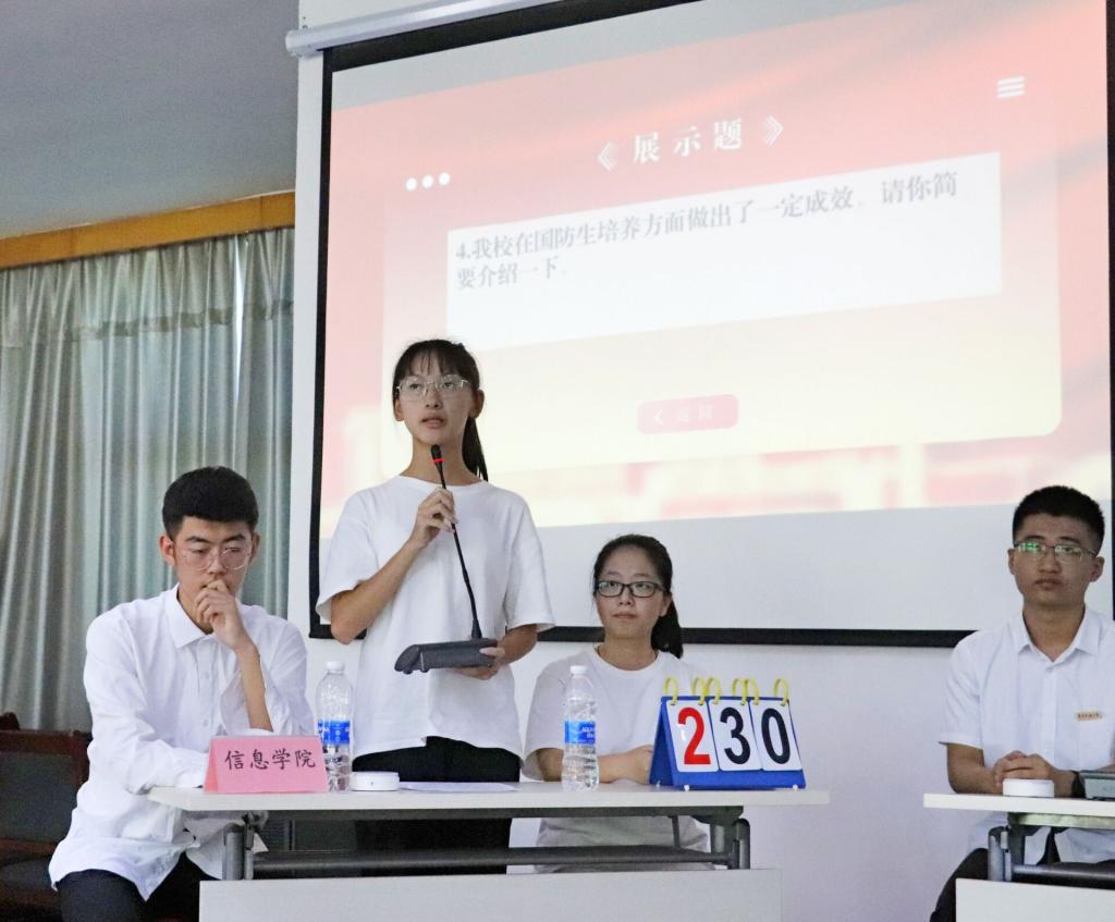 校党委委员、副校长罗文俊在比赛开始前发表动员讲话,她寄语各位选手在接下来的比赛中奠基蓄势,在答题中踔厉奋发,以最佳的精神状态迎接新的百年征程。决赛采用现场答题的形式,第一轮必答环节、第二轮抢答环节、第三轮展示环节。信息学院19级计算机3班吴诗杰、20级通信1班崔泷锟、计算机类1班龚佳音冷静答题,沉着应对,一路过关斩将,取得二等奖的好成绩。