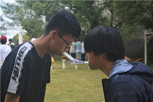 第二环节游戏正式开始,“甜蜜速递”中,队伍成员需要用嘴衔盘子传递糖果,并由上一个人将盘里的糖果传递到下一个人的盘子里,每个队伍最后一人将糖果传到盘子里,在规定时间内终点盘中糖果多的队伍获胜。游戏中,同学们积极配合,团结协作,共同完成了本次接力。也有“贪吃蛇”活动,由一个同学担任蛇头,佩戴上眼罩后进场,而每找到一个球该组就能进入一个小组成员提示“蛇头”寻找下一个小球,率先找到相应数目的队伍获得胜利。游戏一开始便进入到了白热化,两个小组你不让我我不让你,现场气氛十分活跃,两个小组间的趣味干扰也为游戏增添了无限乐趣。