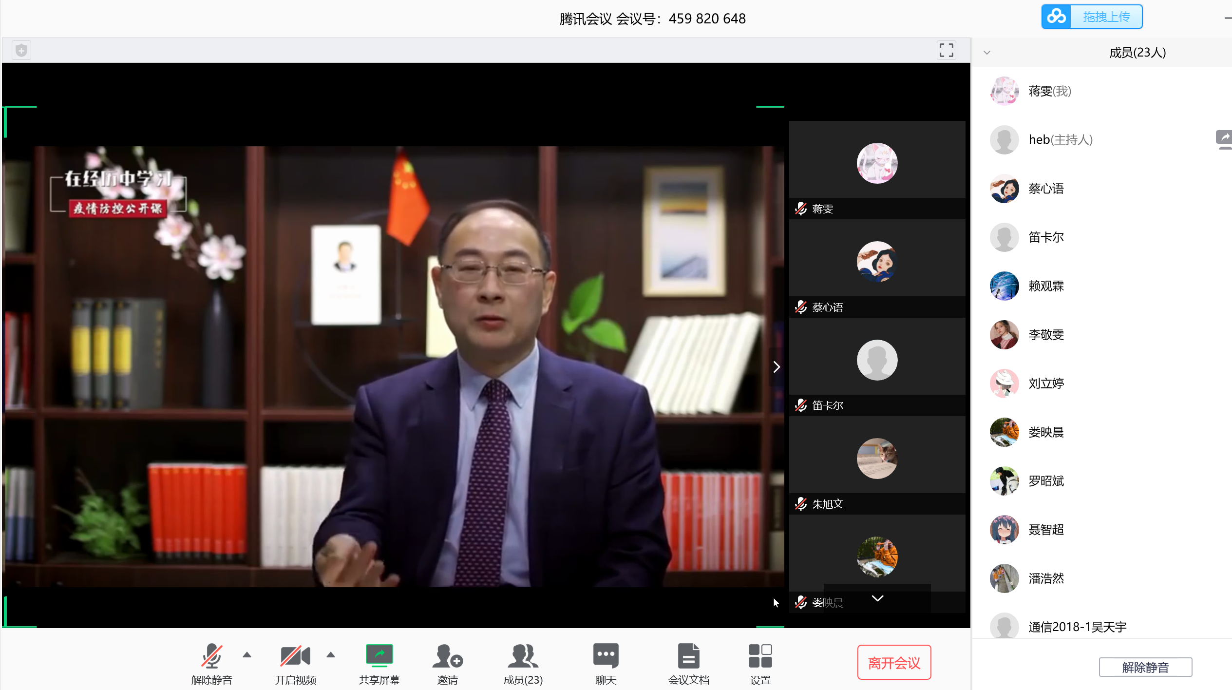 黄恩伯利用桌面共享为学生播放视频《从国际角度看防疫》,视频中中国人民大学教授金灿荣就从古至今,多个国家面对未知的不明来源的疫情时的举措进行例证,肯定了中国在此次疫情的举措。