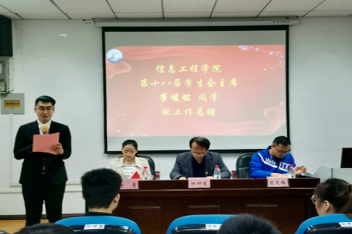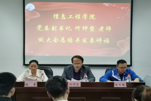 10月18日,信息学院于教4栋307室召开第十九届学生会及团属组织表彰大会,信息学院党委副书记何仲坚、团委书记陈文锦、团委副书记杨青出席本次会议,第十八届、十九届学生会及团属组织干部与会。