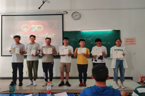 为庆祝中华人民共和国成立70周年,弘扬爱国主义精神,回顾新中国70年沧桑巨变和卓著成就,9月24日,信息学院19级电子信息三班于逸夫楼202室举办“与祖国相拥”主题活动。