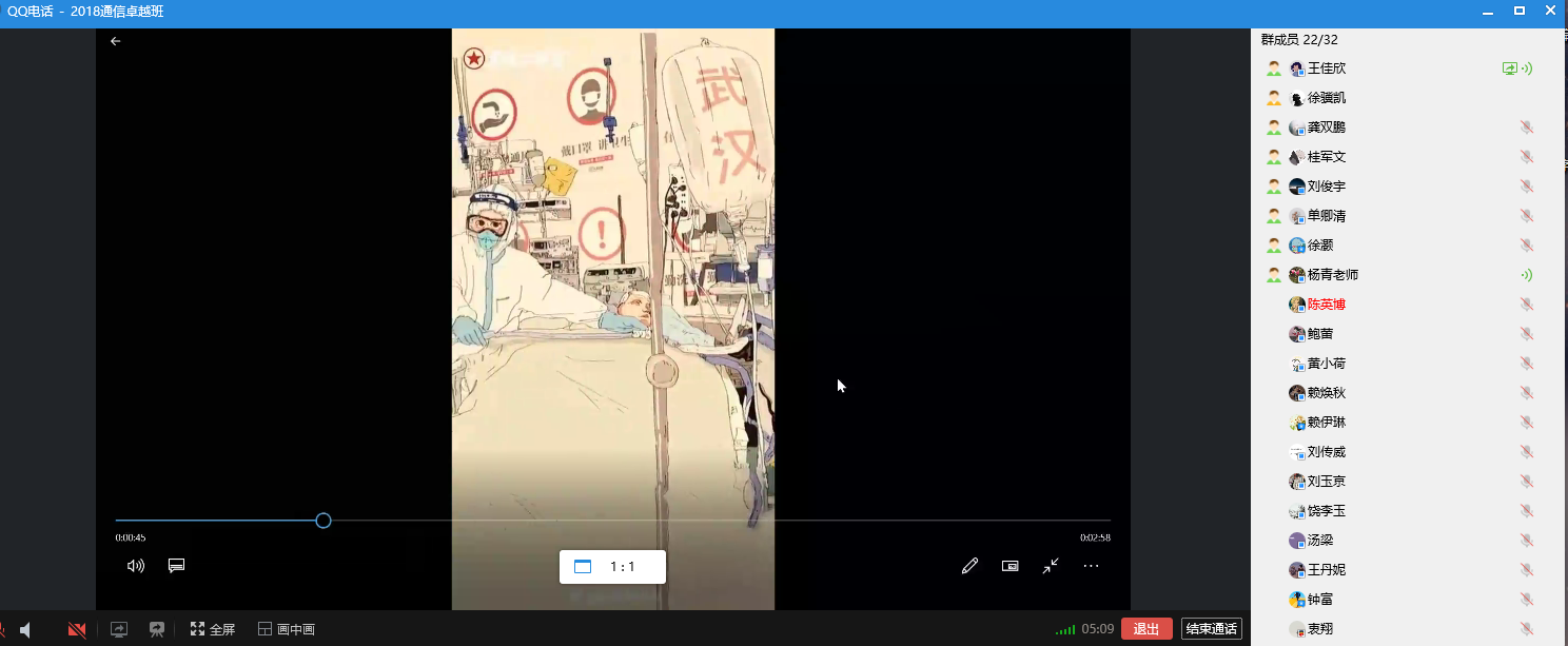 3月12日,信息学院2018级通信工程卓越班团支部在线上开展以“同心战疫情 ,青春勇担当”为主题的团课。辅导员杨青出席本次团课,团支书王佳欣担任主讲人,2018级通信工程卓越班团支部全体成员参与研讨。