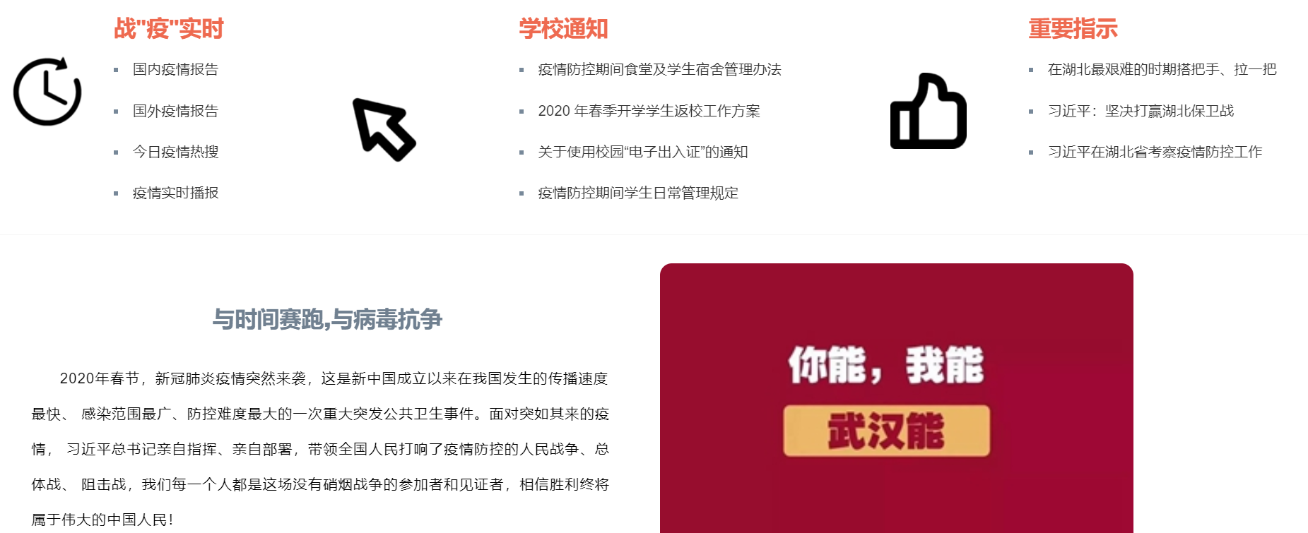 辅导员何仲坚寄语:“自新冠肺炎疫情发生以来,在以习近平同志为核心的党中央领导下,全国上下拧成一股绳,劲处一处使,硬核驰援,共战疫情,让世人见证了中国力量,多难兴邦,相信伟大的中国人民定能战胜疫情,最终实现中华民族的伟大复兴!”辅导员艾国金也表示:“面对疫情的这次大考,全国人民都在极力贡献自己的一份力量,医护人员战斗在一线,各级工作人员履职尽责,真情显现,所有人众志成城,一个也不能少,全体党员身先士卒,每一位公民自觉自知,不传谣不信谣,为疫情攻关贡献自己的力量。”
