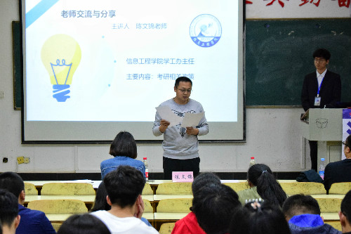 为给同学们普及考研相关知识,营造良好学风。4月27日,信息学院于图书馆203室顺利开展考研座谈会。信息学院学工办主任兼团委书记陈文锦出席会议。