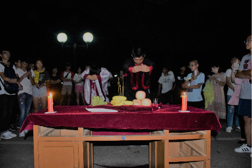 在五彩花灯的拥簇下,身着汉服的男、女二位祭祀人员效仿古法,将月饼、水果、香烛等祭典物品规范摆放。他们手持香烛,鞠躬、上香、祭酒、拜月,向明月祈求“亲朋安,人团圆”。庄重肃穆的祭典仪式让同学们在活动中感受到中华传统文化的独特魅力。