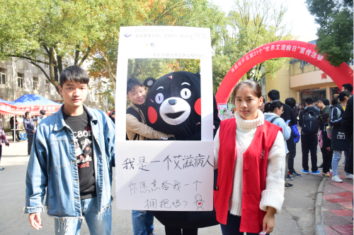 本次活动包括与艾拥抱、寄语祝福、有奖竞答、扎小气球四个环节。工作人员穿上可爱的“熊本熊”的人偶服装,身上贴有“HIV/AIDS”的标志站在路口,吸引了众多学生的目光。同学们积极地参与进来,给玩偶一个大大的拥抱,并主动与它合影留念,现场气氛十分活跃。