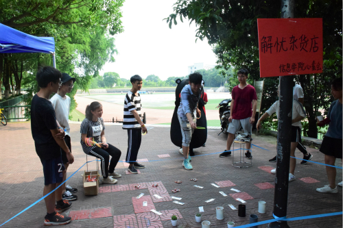 现场气氛火热,活动由“再见坏毛病”、“心理小课堂”、“解忧杂货店”等7个项目组成,参与的同学们手持任务卡前往分布在一食堂周围不同地点的摊位完成相应的任务,获得贴纸,领取精美的奖品。活动现场人头攒动,热闹非凡。