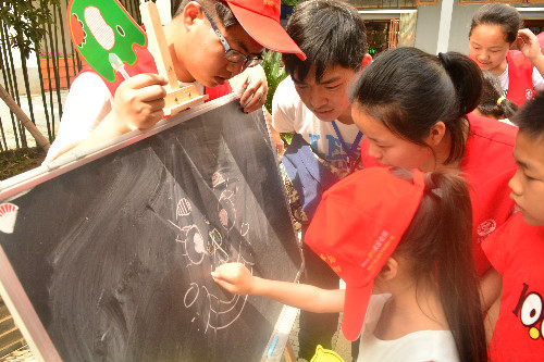 “往这里绕”、“把手伸过来”……在“解环”游戏中,只见志愿者们与孩子们手牵着手,站成一个圆,彼此的手臂相互缠绕在一起,在中心处打成了一个复杂的“绳结”,按规定相互牵着的手不能松开,为了解开这个“绳结”,志愿者与孩子们不断转动着身体,就好似在跳着奇异的“舞蹈”,在“数字传递”游戏环节中,志愿者需要手脚并用地摆出夸张的姿势来告诉孩子们所要传递的数字,孩子们心领神会后再将数字以动作演示的方式传递给其他人,在默契的配合之下各组很快就完成了数字传递的任务。“谁言寸草心,报得三春晖。”一位身穿米黄色连衣裙的小姑娘在制作给妈妈的贺卡上写下了孟郊的《游子吟》,并在诗的旁边画了一个大人和一个可爱的小人,“这是妈妈,这是我”指着图画,小姑娘羞涩地说。
