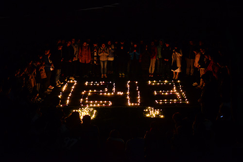 田径场上刮着阴冷的风,办公室人员用蜡烛和荧光棒摆出“12·13南京”的图案,学生会全体成员到场并围绕蜡烛站成心形图案,为惨遭屠杀的南京同胞默哀,场面肃立。在沉痛哀悼后,全体成员在学生会主席张祖耀的带领下高唱国歌,提醒同学们勿忘国耻,振兴中华。