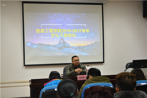 为了进一步提高学生干部工作能力水平,明确学生干部的工作职责。11月22日,信息学院于教4栋307室开展主题为“不忘初心,方得始终”的学生干部培训第二课。信息学院团委书记陈文锦主讲,第十六届学生会主席团部长团,2015、2016级各班班长、团支书参加此次培训。