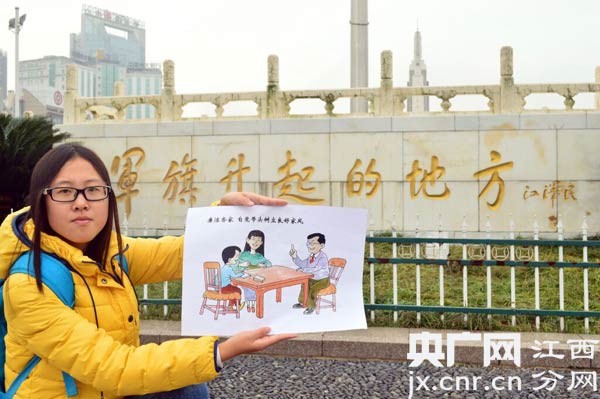 衣着简单朴素的干部、整洁干净的画风、简短浓缩的八条禁令……11月21日,华东交大八位入党积极分子将《中国共产党廉洁自律准则》以漫画的形式进行展现,并与南昌英雄城八一起义纪念塔、八一大桥、八一起义纪念馆、八一大道等多处“八一建筑”合影。