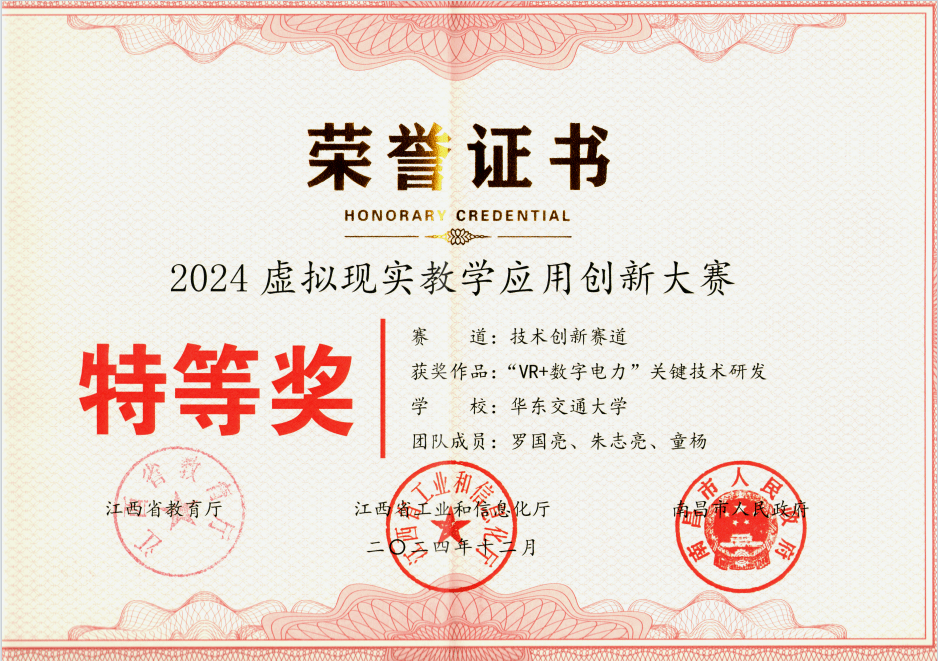 虚拟现实与交互技术研究院(VRITI)自2017年成立以来,始终致力于V/AR的算法、技术、系统及其应用等方面的研究与开发,并与我校轨道交通、智慧建维等多个主要学科深入开展前沿的交叉合作和人才联合培养。团队VR科研成果先后获得江西省技术发明奖二等奖、多人入围省级人才项目等一系列荣誉。此次获奖不仅是对研究院团队VR科研实力的认可,更是对其在虚拟现实技术教学应用领域创新实践的肯定。