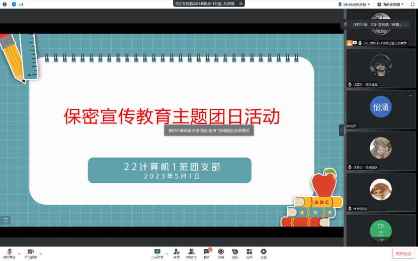 为进一步增强全员保密意识和国家安全意识,自觉履行保守国家秘密和维护国家安全的义务,信息学院各团支部在“五四”青年节期间开展线下线上相结合的保密主题团日活动。各团支书从什么是保密、开展保密教育的意义、怎样做好安全保密工作三方面做了详细介绍,组织支部全体团员共同观看2023年保密公益宣传片,通过观看短视频的方式从保密科普教育和保密传统教育两方面深入学习安全保密知识。