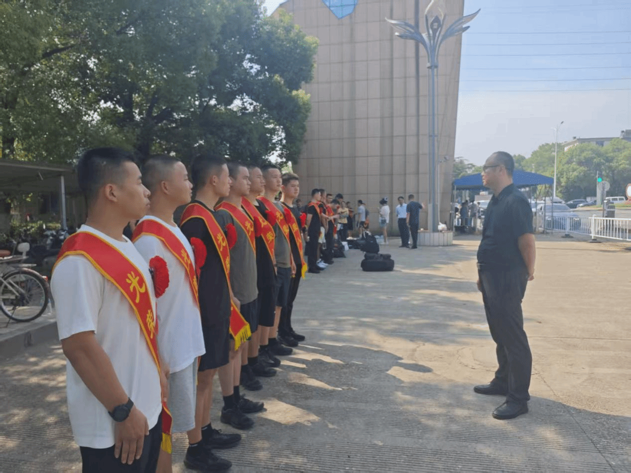 辅导员们为应征入伍的学生代表佩戴光荣绶带,红色绶带既承载着保家卫国的荣耀,也凝聚着母校师生的殷切期盼。